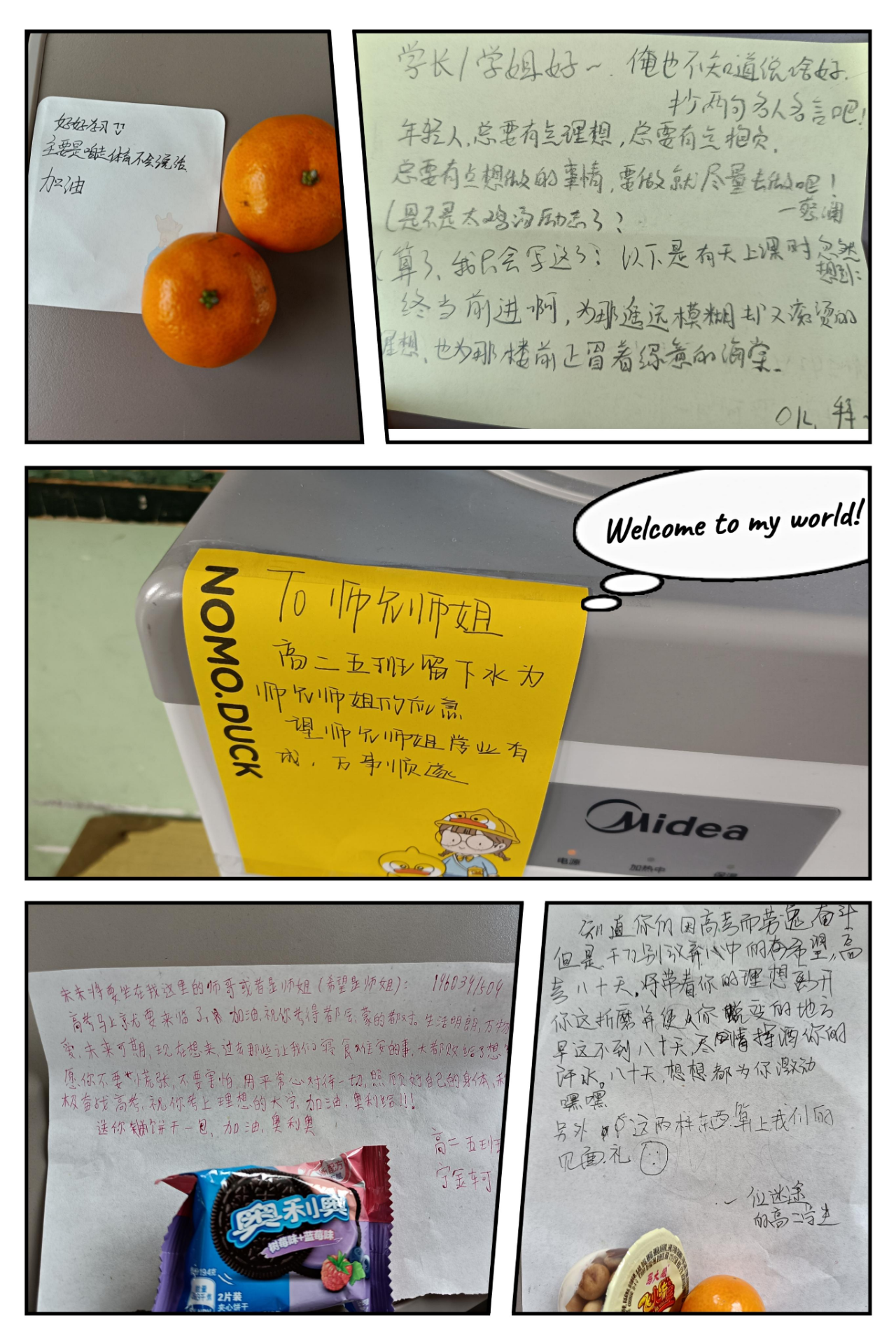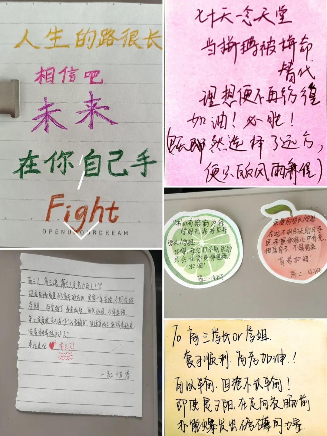 只要青春还在,我就不会悲哀,纵使黑暗吞噬了一切,太阳依然将重新升起;只要生命还在,我就不会悲哀,纵使置身于茫茫沙海,还有希望的绿洲存在;只要明天还在,我就不会悲哀——冬雪终会悄悄融化,春雷定将滚滚而来!根据疫情发展变化情况,按照上级部门的相关要求,20日上午,高二年级全体住校生同学按计划分批有序离校,全部转为线上学习。在离校的过程中,三中学子的素养体现得淋漓尽致:佩戴口罩,不聚集,不打闹,有序进出,疫情防控要求烂熟于心。更有不放弃任何一分钟的坚持、对高三学长学姐的祝福和对自己的严格要求。 留给高三学长学姐的小纸条勾勒出一幅幅可爱又认真的面庞,阅读着一字一句的话语,不论是即将走上征程的学子,还是守望相助的老师们,都不禁心中惊喜,继而为之动容……