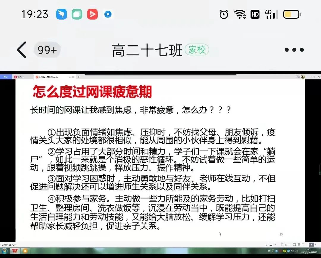 20日晚,各班主任老师和全体家长“心手相牵、共赴未来”,回顾过去几天孩子们的基本学习情况,并对过往成功的育人经验进行总结分享;对接下来的全员线上学习进行了细致安排,包括每天的详细规划、网课的基本要求、早读与自习的基本规范、作业的收缴与检查及“阳光课间”的实施方案;同时强调了当前疫情防控的重要性,切实关注到每一位孩子的心理健康与生命安全。一句句诚恳的话语、一声声温暖的鼓励,家庭与校园之间的桥梁变得更加坚固,变得愈发牢不可破、紧密相连!