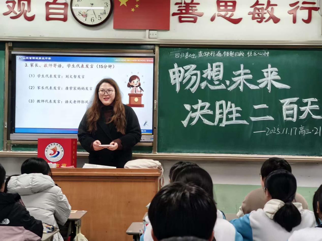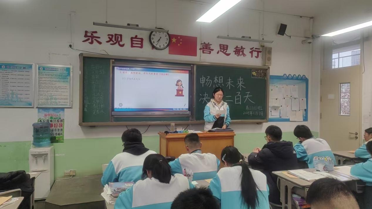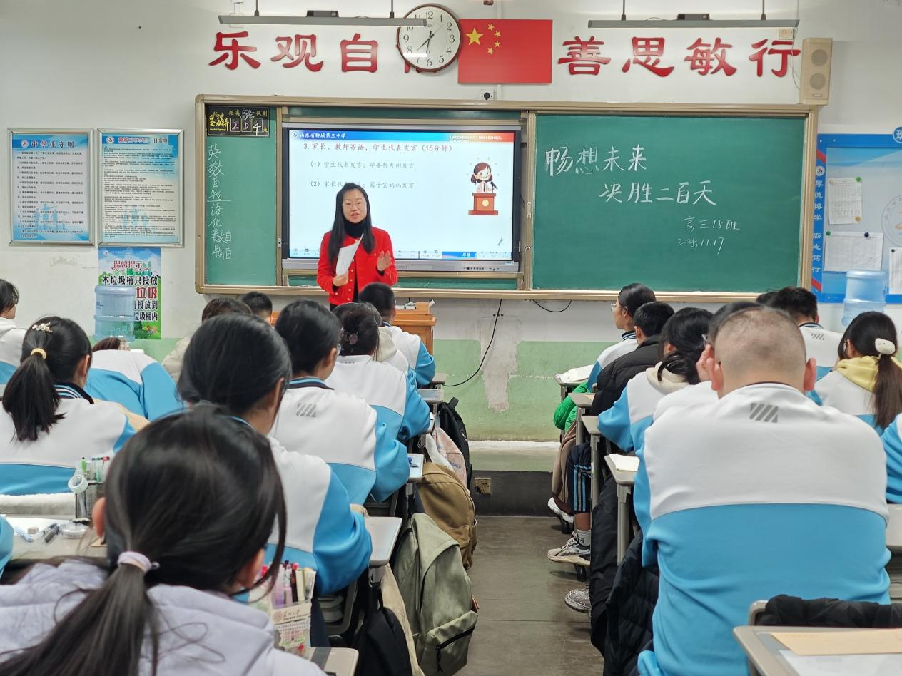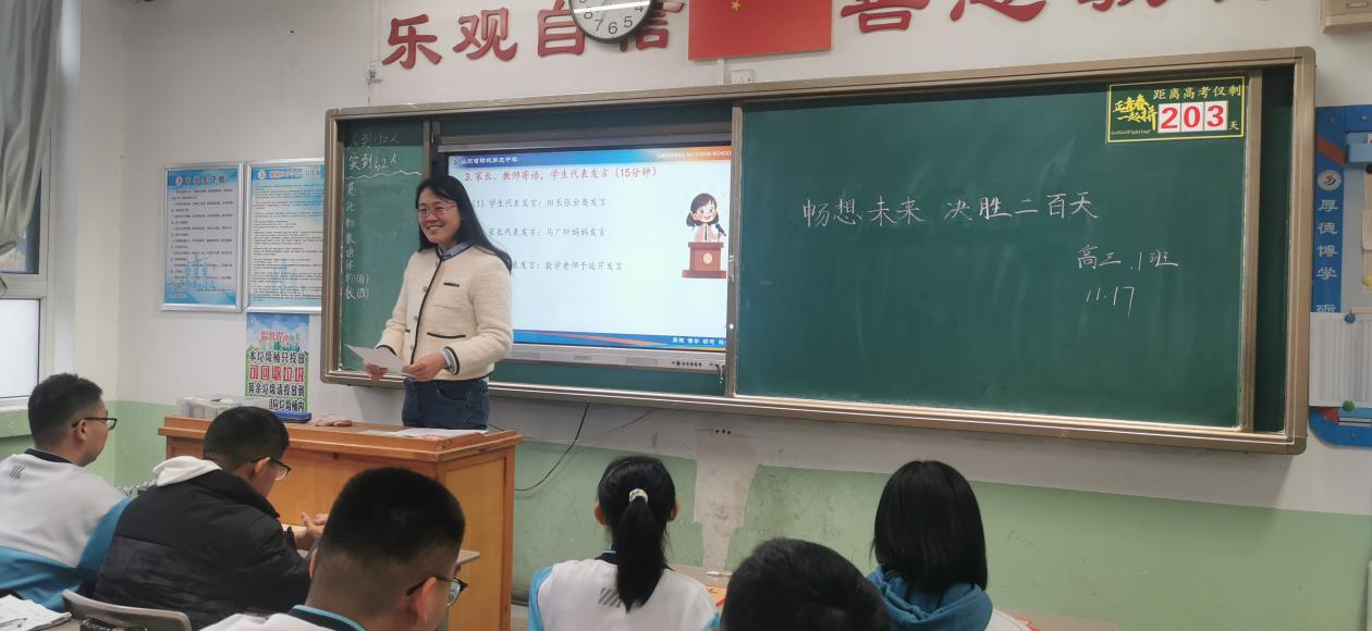 教师代表们在各班班会上的发言既充满智慧又饱含深情。他们郑重承诺:“未来200天,我们将全程陪伴,做你们追梦路上最可靠的引路者。请相信老师的专业指引,紧跟我们的复习节奏,我们定能共同跨越每一个难关!”这些话语给予了学生莫大的信心和力量。