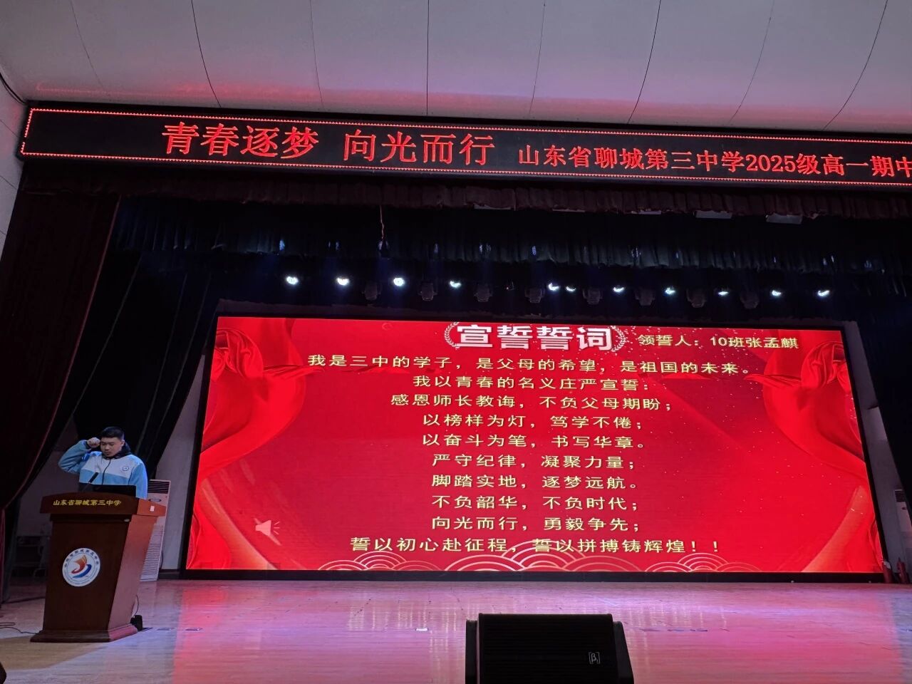时序初冬,寒意渐浓,聊城三中大礼堂内却暖意融融、士气昂扬。11月29日晚,高一年级期中考试表彰大会如期举行。聊城三中党委副书记、校长王永辉,副校长刘习锋等领导与高一年级全体学生、班主任及部分家长代表齐聚一堂,以表彰树榜样,以同心育新苗,共赴一场关于成长与奋进的青春之约。