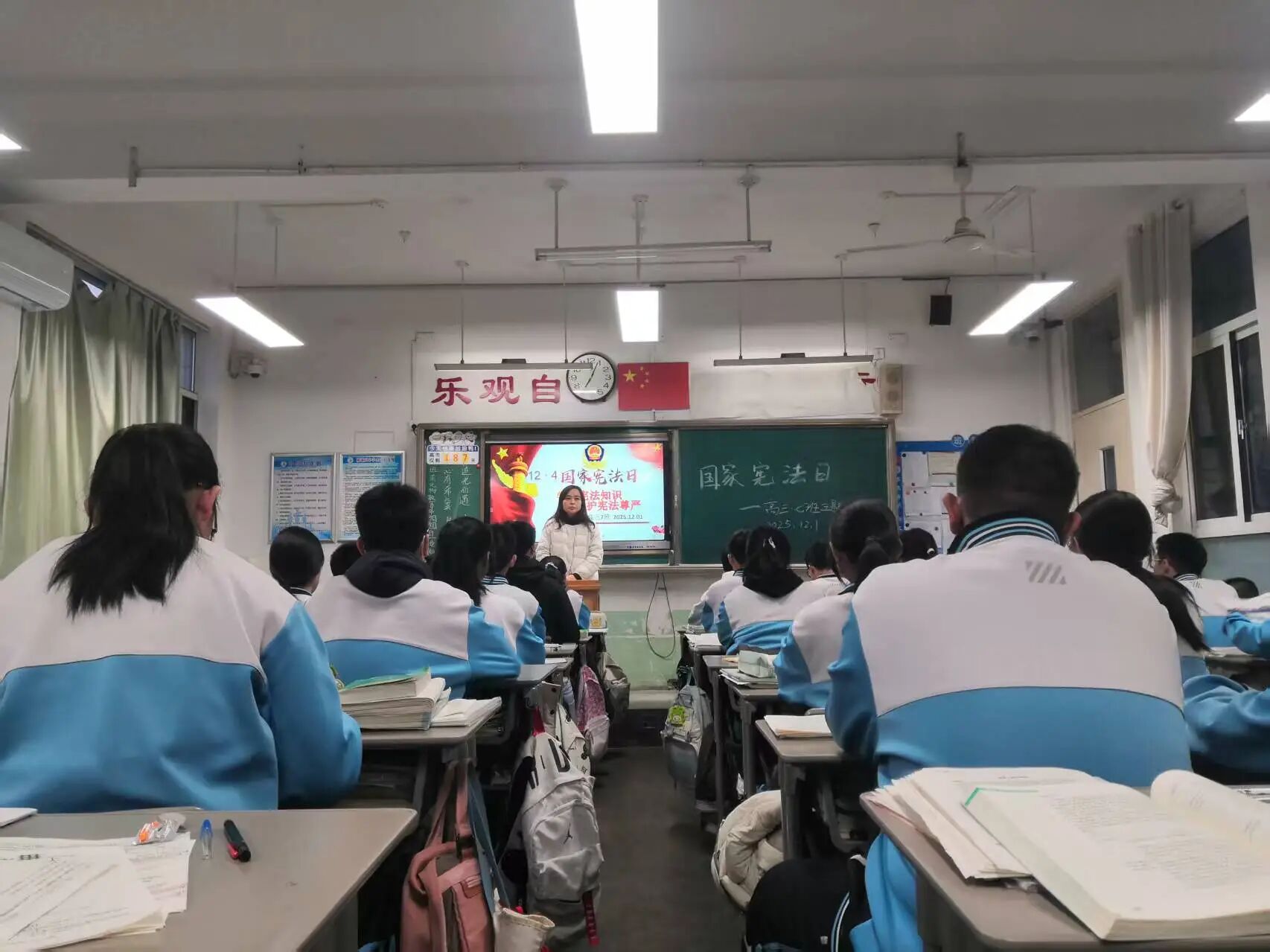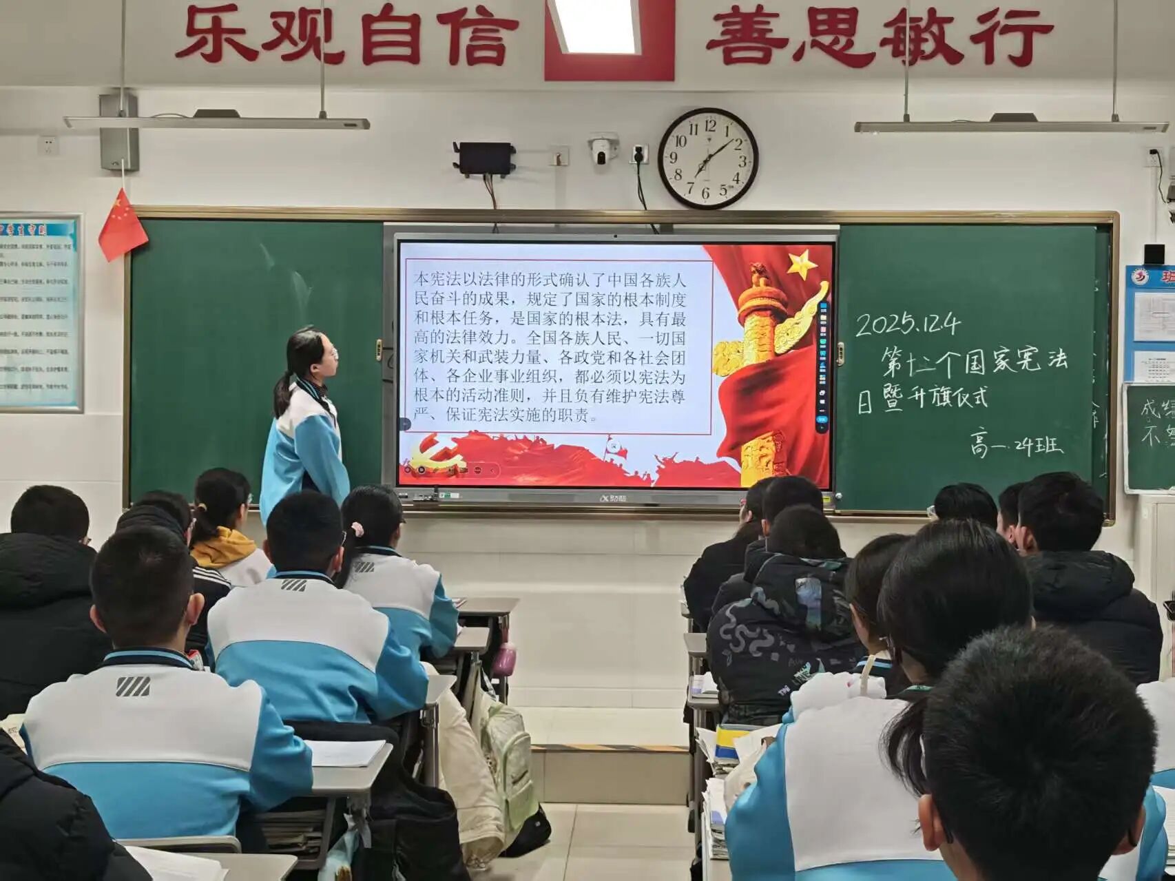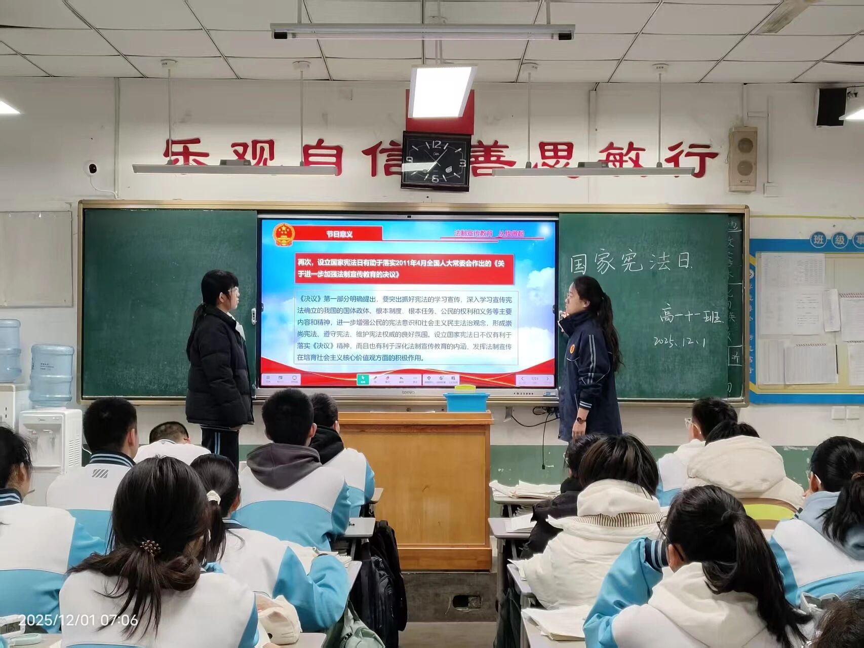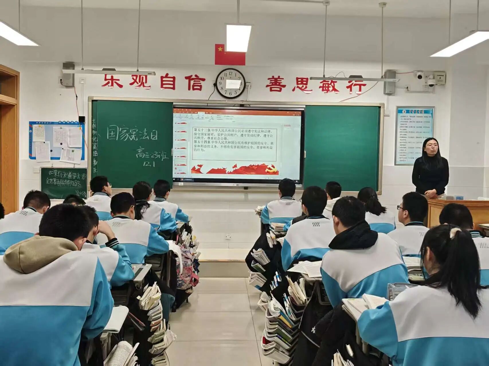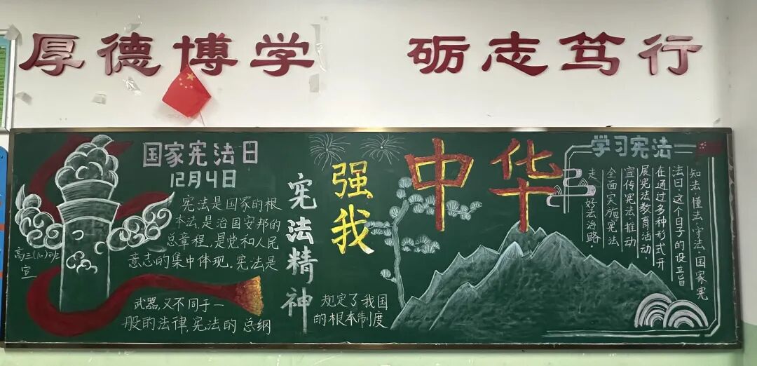 学习宣传习近平法治思想,大力弘扬宪法精神。班会课上班主任们带领学生一起学习了解了:宪法是什么?宪法的地位?宪法规定了哪些内容?并知道了宪法日的确立,不仅是对我国根本大法的崇高致敬,更是对我们每一个公民宪法意识的一次深刻唤醒。它旨在增强全社会对宪法的认识与尊重,通过弘扬宪法精神,加强宪法的实施力度,全面推进依法治国的伟大进程。