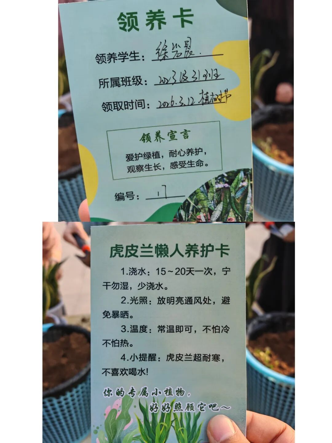 活动一:高三学习压力大,节奏快,在紧张的奋斗之余,愿以一株虎皮兰,承载学子们不屈的汗水与拼搏的坚韧。领取属于自己的春天,在生物老师们的指导下亲手培土、浇水,带回自己的“奋斗小窝”,它将在你的呵护下逐渐生长,与你一同迎来青春最盛大的花开。