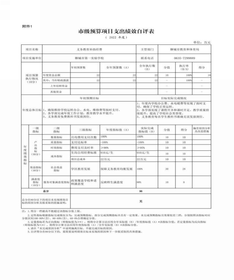 1.义务教育补助经费项目绩效自评综述:根据年初设定的绩效目标,项目自评得分为96分。全年预算数为22万元,执行数为22万元,完成预算的100%。项目绩效目标完成情况:一是年度内学校办公费、水电暖费等实现了按时支付,确保了学校正常运转。二是各学部实现了课程开齐,课时开足,教学质量持续提升,提高了学校社会美誉度。三是义务