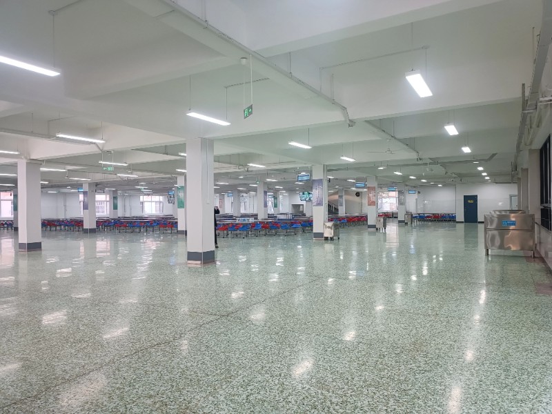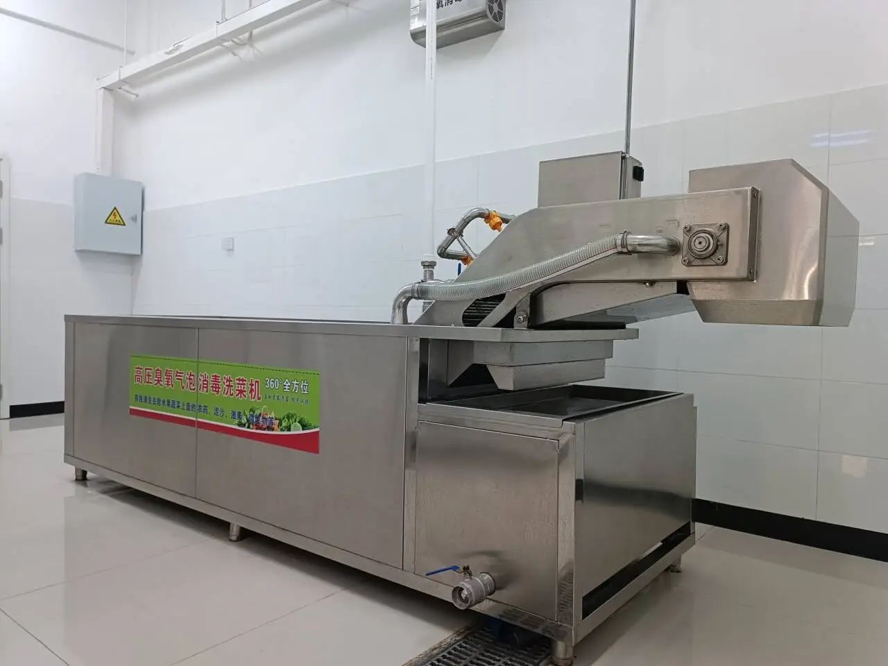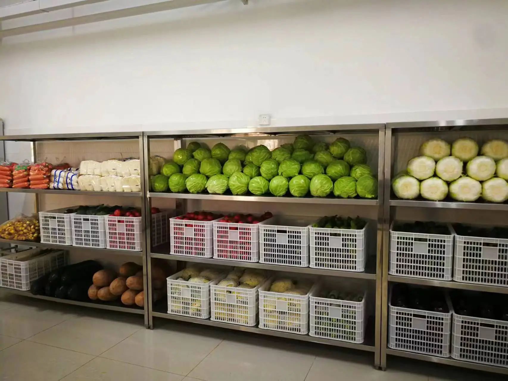 (窗明几净的餐厅、打饭窗口、高科技洗菜机和摆满新鲜优质蔬菜的架子)