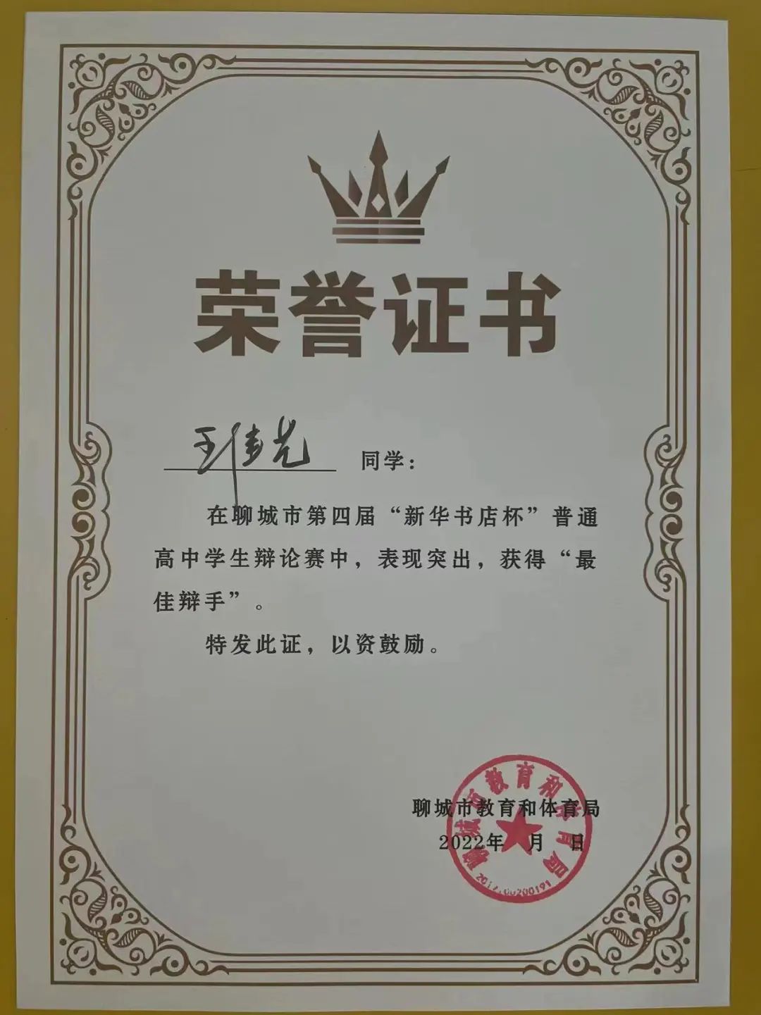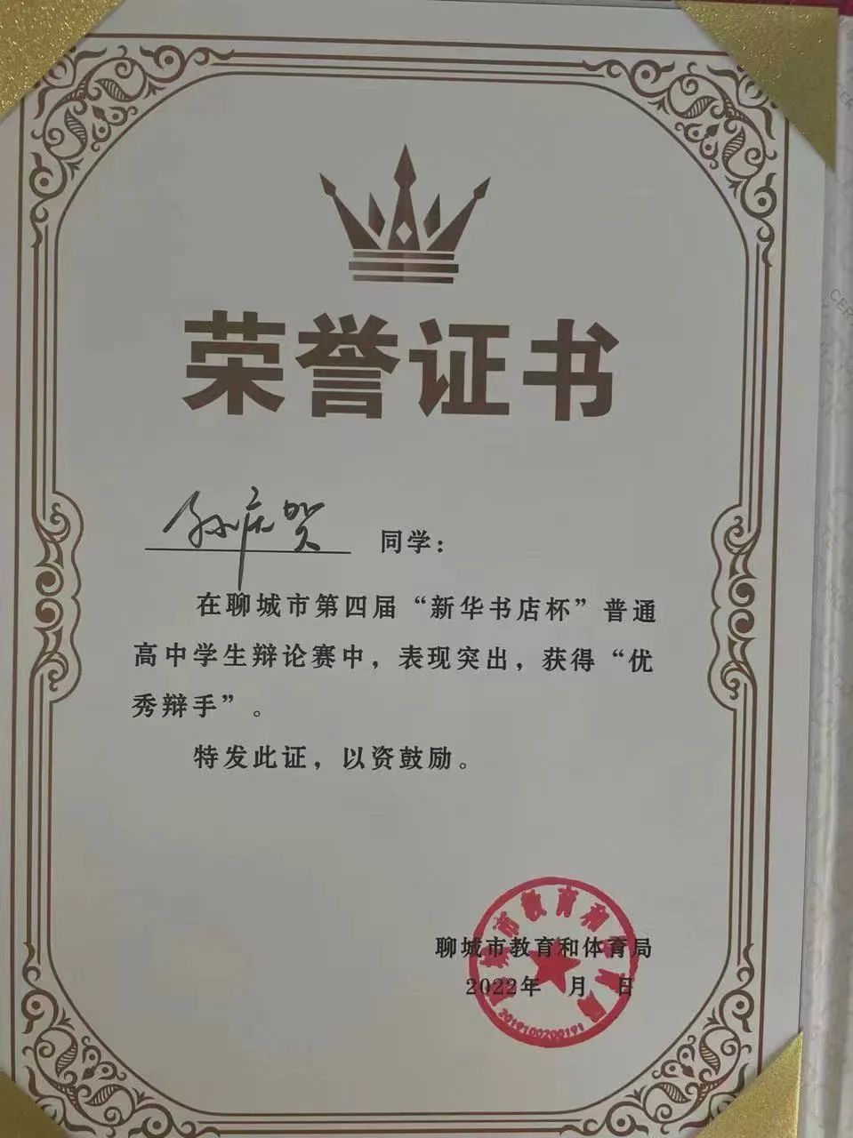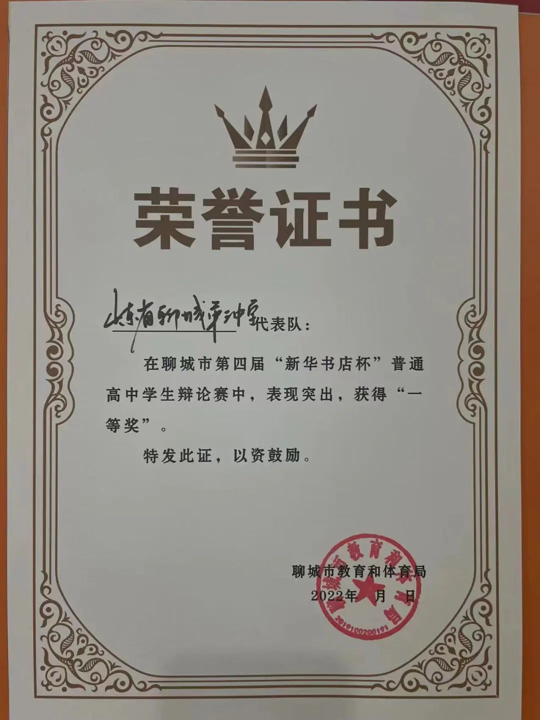 7月8日,在刚刚结束的聊城市第四届“新华书店杯”普通高中学生辩论赛中,聊城三中辩论队舌战群雄、杀出重围,获得一等奖第一名的好成绩,并将代表聊城市参加省比赛。聊城三中辩论队王佳艺同学获得最佳辩手奖,孙庆贺同学获得优秀辩手奖。