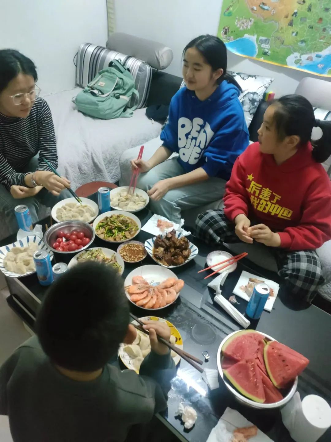 “上次孩子来我们出去吃的火锅,这几天天热,就说在家里随便炒个菜吃点也挺好,结果老人非要给孩子买西瓜,两个大小伙子光啃西瓜了,再吃饭都说撑着了。”