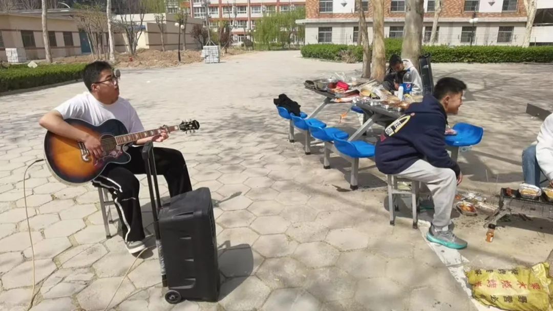 一根根串儿递到同学手中,因果腹而满足的感叹此起彼伏。即使火苗的温度令眼睛有些酸涩,可大家仍盯着烤架上的食材,生怕多眨一下眼睛就会烤焦;已经吃饱的同学抱出吉他,在场地一旁唱起了民谣;主厨们则在频繁的翻动中抽出空来,昂头“撸串”一把,喉头“咕嘟”一声,小小的场地里氤氲着大大的豪情。