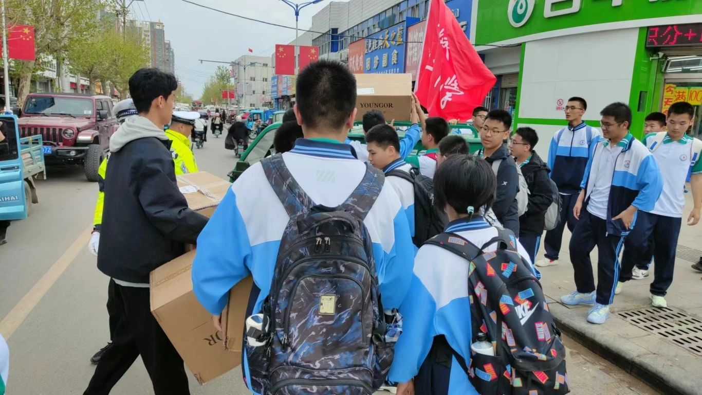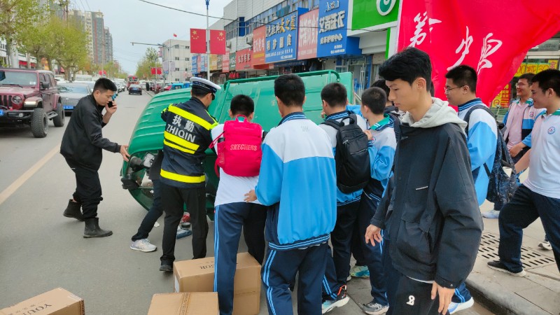 在远足途中,碰到一辆载满货物的电动三轮车发生侧翻,三中师生和交警纷纷积极伸出援手,帮助车主将散落的货物搬回车内,这不就是我校始终贯彻的日行一善的体现吗?