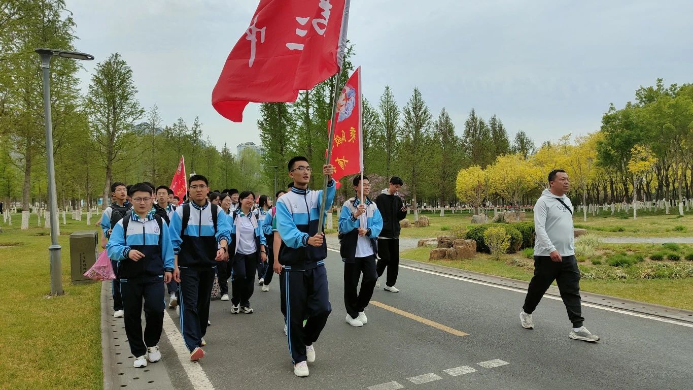 师生们满怀期待地出发,校旗旗手英姿飒爽地引路,各班旗手紧随其后,依次引领班级前进,踏青春歌路,赏春光旖旎。