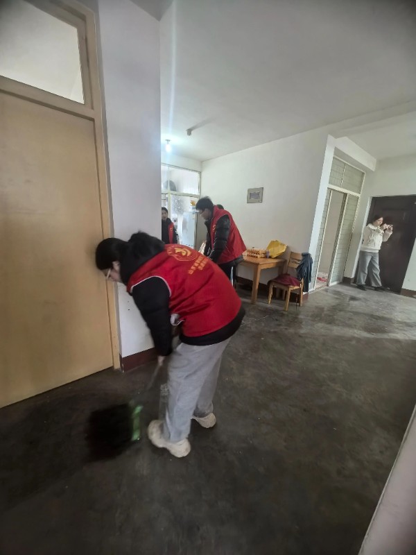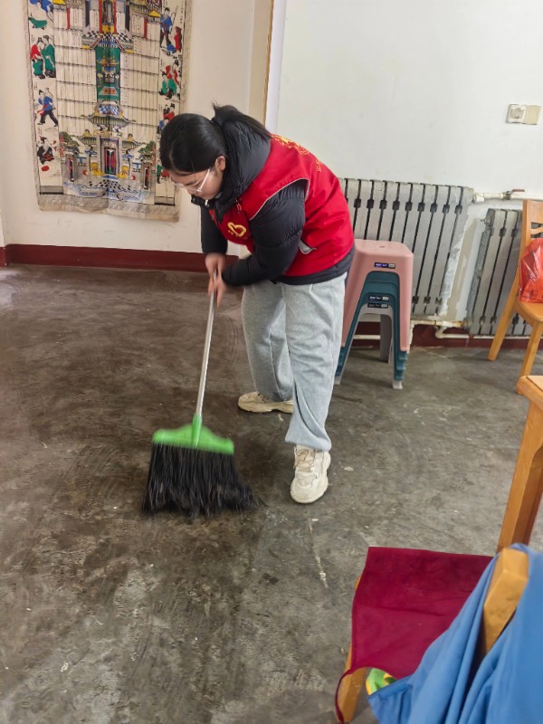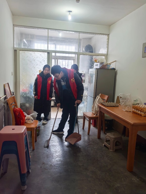 活动当天,团员志愿者们在老师与社区工作人员的带领下,分组前往高龄老人家中。大家分工协作、干劲十足,清桌面、扫地面、整理杂物,同学们耐心细致、动作轻柔,一边认真打扫,一边陪老人拉家常,询问身体状况与生活需求,用真诚陪伴驱散孤单、送上贴心关怀。