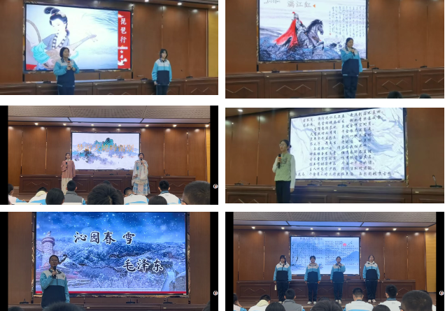 11月29日下午四点,从各班脱颖而出的同学登上年级汇演的舞台,尽显创意与风采。从“数风流人物,还看今朝”的豪迈,到“收拾旧山河,朝天阙”的壮志,从“惊涛拍岸,卷起千堆雪”的雄奇到“仙之人兮列如麻”的瑰丽,从“同是天涯论人”的伤感到“与尔同销万古愁”的洒脱,他们时而低沉,时而高亢,对诗歌的演绎丝丝入扣,为全体师生呈现了一场高质量的诗词盛宴,全体师生都为他们的表演深深打动。