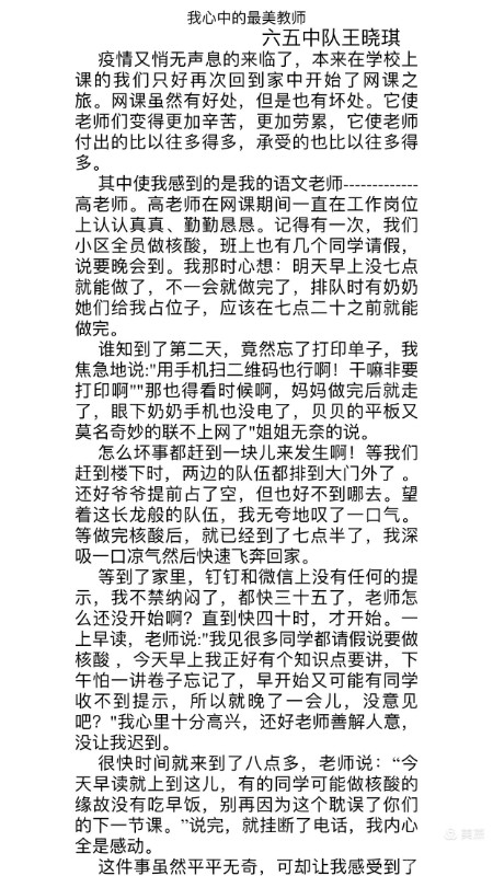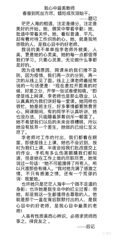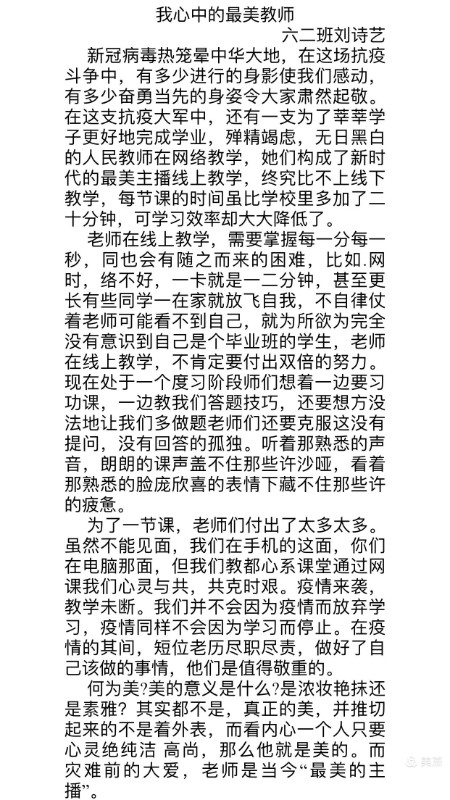 因疫情原因,学校教学模式由线下教学改为线上教学,相比线下教学,线上教学对老师们的要求更高,付出也更多,辛勤的园丁们就是最美的劳动者!六年级队员们用朴实的文字,真挚的情感写下一篇篇最美的赞歌!