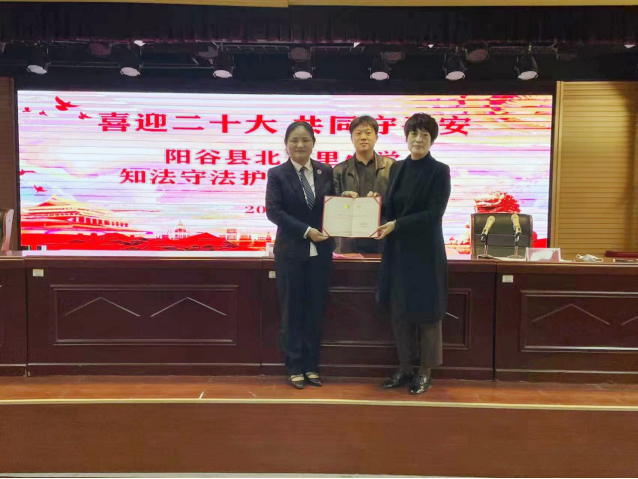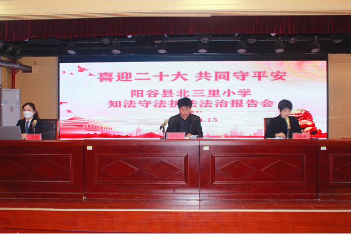 为进一步增强学生法制观念,营造文明、平安、和谐的校园环境,促进学生的健康成长,4.15日,阳谷县北三里小学邀请聊城市优秀校外大队辅导员、阳谷县北三里小学特聘校外大队辅导员范传志和阳谷县公证处三级公证员王先利女士到阳谷县北三里小学开展法制教育报告活动。杨风杰主持会议,并发表致辞。她表示,没有规矩,不成方圆,国有国法,校有校规,学生知法懂法是时代的要求。