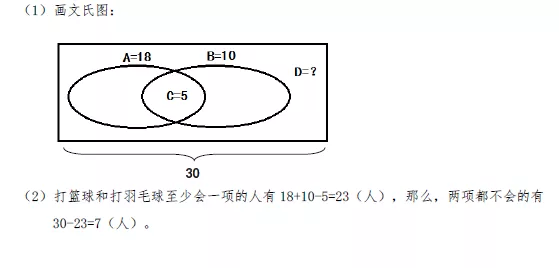 有30人学习打球,一段时间训练后,有18人学会了打篮球,有10人学会了打羽毛球,其中既会打篮球又会打羽毛球的有5人,那么既不会打篮球又不会打羽毛球的有多少人?爸爸比女儿大28岁,已知5年后爸爸的年龄将是女儿年龄的3倍.那么爸爸和女儿今年的年龄各是多少?