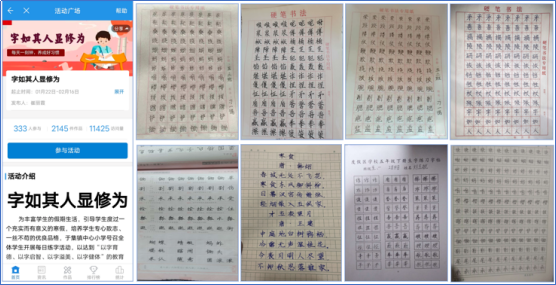 汉字和以汉字为载体的中国书法是中华民族的文化瑰宝,是人类文明的宝贵财富。于集镇中心小学以“字如其人显修为”为主题,学生每天坚持打卡练字,在循序渐进中锻炼自身毅力、在书写中感受“养成式”乐趣。