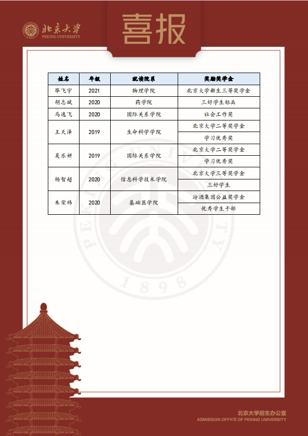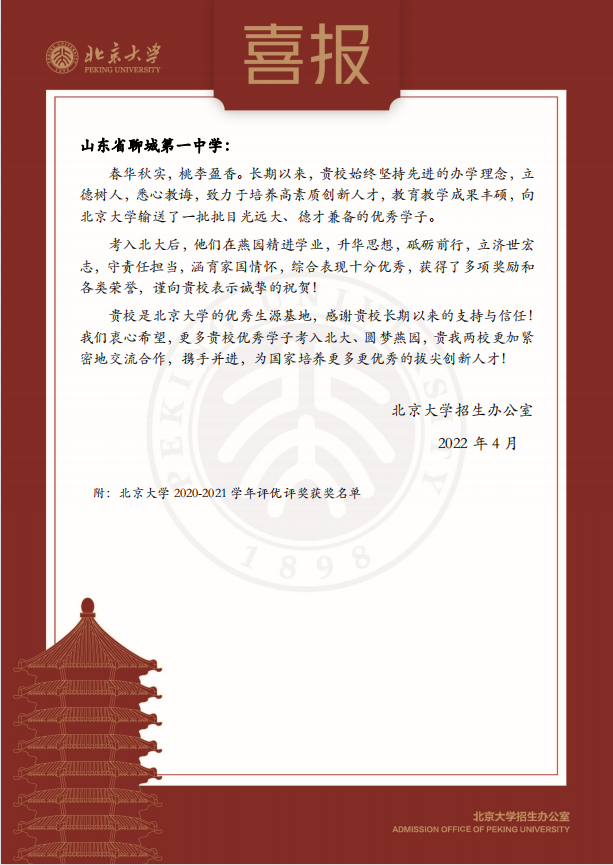 4月8日,北京大学向我校发来喜报,祝贺聊城一中升入北京大学的毕飞宇、胡志斌、马逸飞、王天泽、吴乐妍、杨智超、朱荣祎等7名同学,在2020-2021学年评优评奖中获得优异成绩。在对我校多年来一直为北京大学输送优质生源表示感谢的同时,肯定了我校全力培养同学们全面发展的教育担当和育人初心,并期待与我校携手共进,着力培养更多的创新拔尖人才。