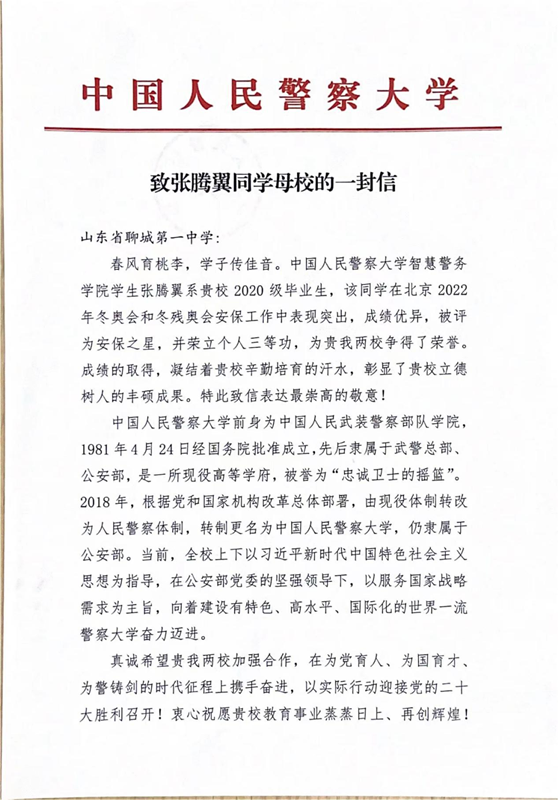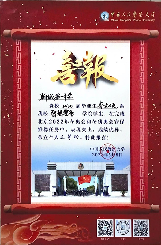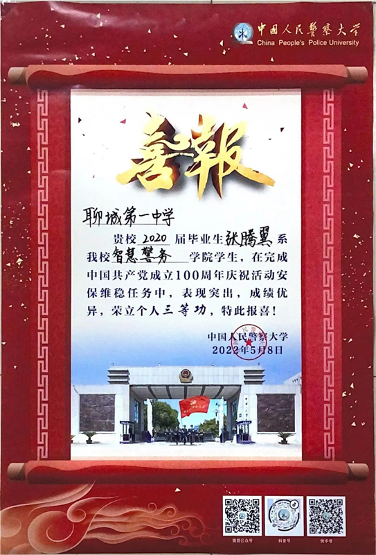 喜报中,中国人民警察大学希望与我校加强合作、共育英才,并祝愿我校教育事业蒸蒸日上,再创辉煌!