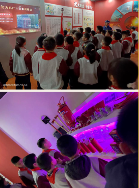 进入场馆后,小队员们认真倾听讲解员老师介绍生活中常见的消防器材和消防安全标识。
