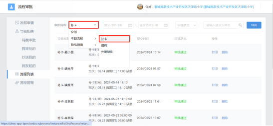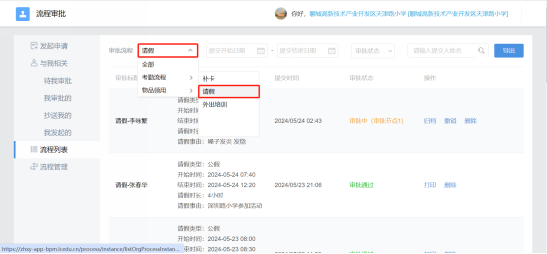请假申请等需求联动“流程审批”,规范教师考勤流程,同时为管理者生成考勤管理数据,使学校形成高效的考勤管理机制。