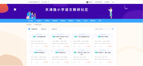 我校本学期教研分为学科组大教研和青蓝工程教学帮对小教研。基于教研社区平台应用,教师将线上教研与线下教研充分结合,组建教研主题特色空间,通过“专题活动”将教研活动的研修记录和研修成果进行展示,促进校级教研成果汇聚共享,通过“听评课”模块记录教研过程、发表个人反思、完成二次教研,从而将集体研究成果内化为个人知识,使教师专业化水平高提高。